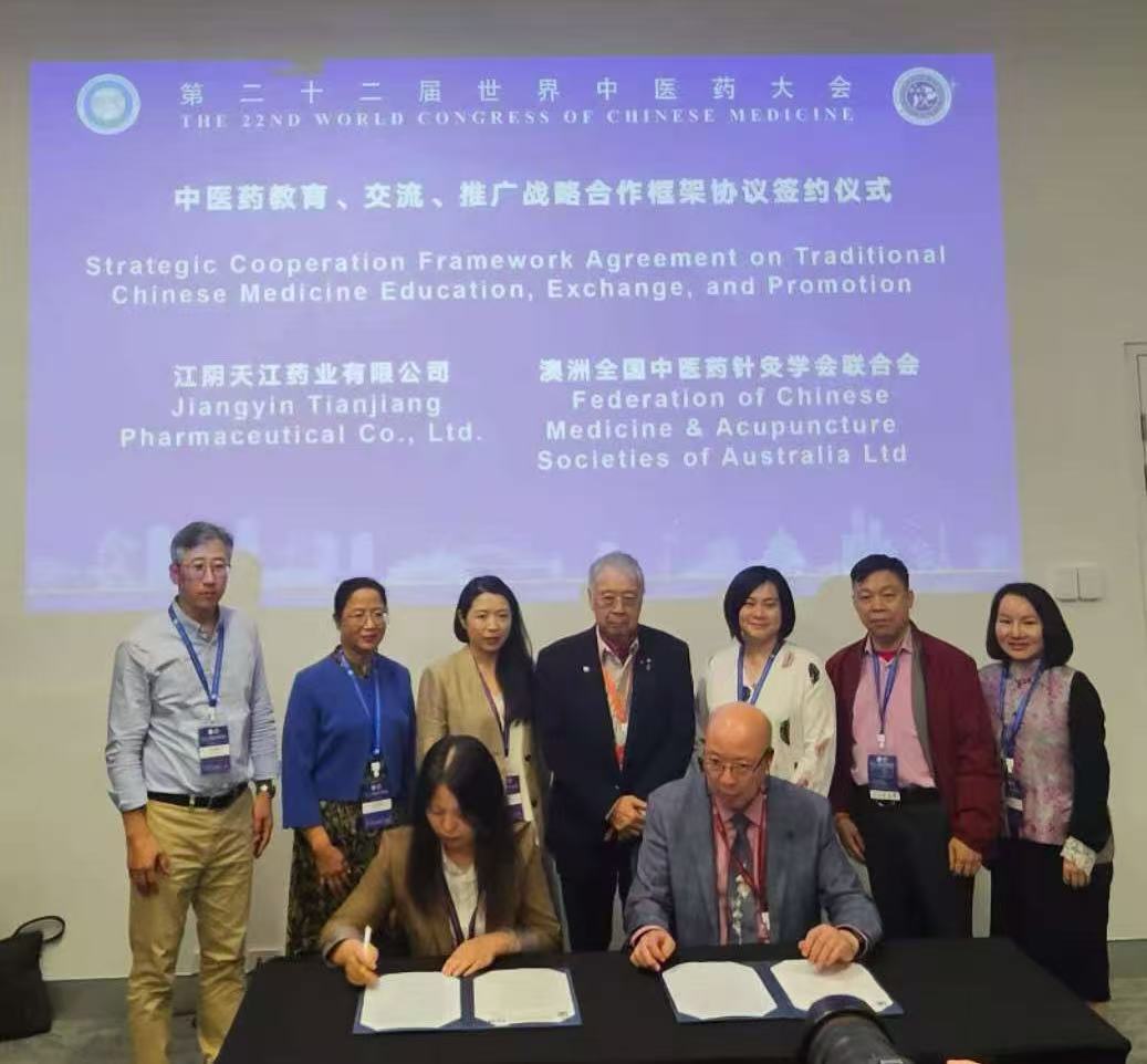 In 2025, Jiangyin Tianjiang Pharmaceutical Co., Ltd. and the Federation of Chinese Medicine & Acupuncture Societies of Australia (FCMA) formally signed a strategic cooperation framework agreement, initiating comprehensive collaboration in the fields of traditional Chinese medicine education, academic exchange, and promotion. The signing ceremony was attended by, among others, representatives from Tianjiang Pharmaceuticals and Mr. Liu Chijing, a representative from FCMA.