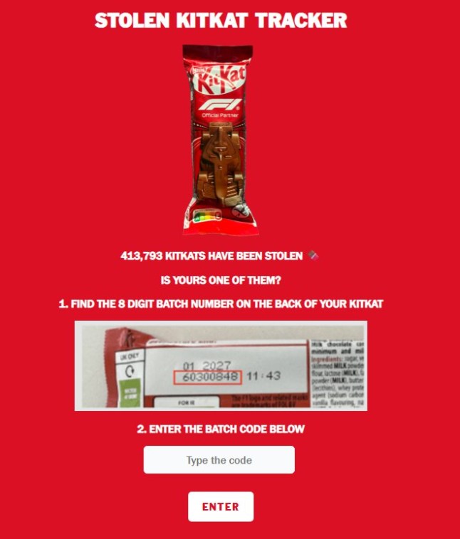 Nestlé has set up an online stolen KitKat tracker for shoppers to check their bars (Picture: stolen KitKat Tracker)It said in a statement following the theft: ‘We’ve always encouraged people to have a break with KITKAT – but it seems thieves have taken the message too literally and made a break with more than 12 tonnes of our chocolate.‘Whilst we appreciate the criminals’ exceptional taste,the fact remains that cargo theft is an escalating issue for businesses of all sizes.‘With more sophisticated schemes being deployed on a regular basis,we have chosen to go public with our own experience in the hope that it raises awareness of an increasingly common criminal trend.’Get in touch with our news team by emailing us at .Boy, 9, can no longer walk after being locked in dad's van for nearly 500 days